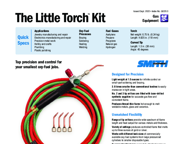 Little Torch™ Replacement featuring European Hose Fittings: This replacement torch includes 8 ft. (2.4 m) oxygen and fuel hoses. The hoses are securely attached to the torch handle with European fittings, specifically Oxygen G-1/4"-19 RH and Fuel G-3/8"-19 LH fittings.