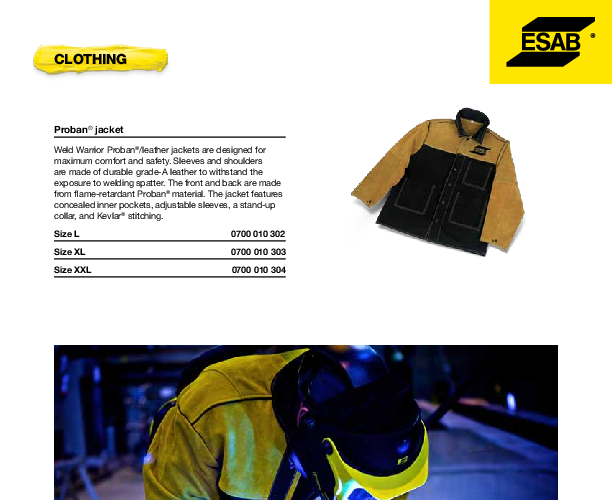 The ESAB Proban/Leather Welding Jacket (SKU: 0700010304) represents a strategic evolution in personal protective equipment (PPE) for the welding industry. Designed to bridge the gap between full leather durability and the lightweight comfort of cotton, this hybrid jacket offers the best of both worlds. The critical areas of a welder's upper body—specifically the shoulders and sleeves—are the most exposed to high-velocity spatter, sparks, and radiant heat during MIG and Stick welding operations. To address this, ESAB has constructed these zones from premium cowhide leather. This natural material provides a robust barrier against burns and abrasions, ensuring that the areas taking the brunt of the work remain protected shift after shift.