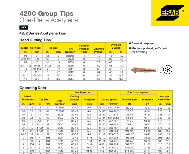 The ESAB® Purox® 4207 Series Size 19 Acetylene Nozzle/Cutting Tip is equipped with a groove width of 3/8 - 7/16" and a depth of 1/4 - 3/8". Operating at a gas pressure of 45 - 50 PSIG for cutting oxygen and 12 - 14 PSIG for acetylene, this nozzle ensures precise cutting. With a gouging speed of 1.6 - 2.2 ft/min and a gas consumption requirement of 268 - 303 CFH for oxygen and 50 - 55 CFH for acetylene, it efficiently serves grooving, gouging, and plate edge preparation needs. Trust its reliable design for exceptional performance.