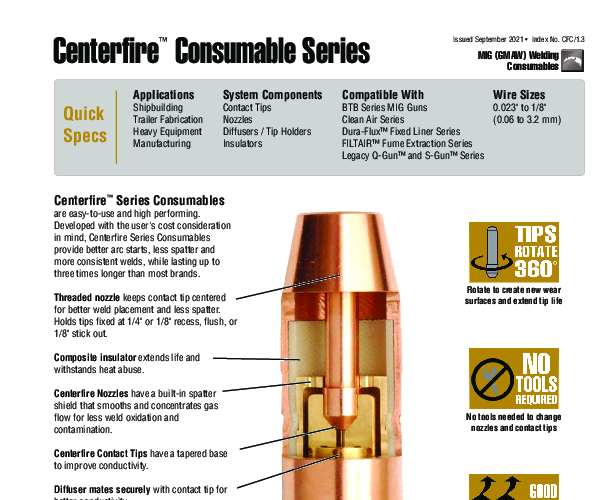 The Bernard TT-052 is a specialized tapered contact tip designed for use with the Centerfire consumable system. Engineered for .052-inch (1.3mm) MIG welding wire, this component addresses specific fabrication challenges related to joint access and thermal management. Unlike traditional threaded contact tips, the Centerfire series utilizes a "drop-in" design. This threadless architecture relies on the nozzle to secure the tip against the gas diffuser, creating a substantial surface area at the base of the tip. This increased contact area significantly improves electrical conductivity and heat transfer, resulting in lower operating temperatures and extended consumable lifespan.