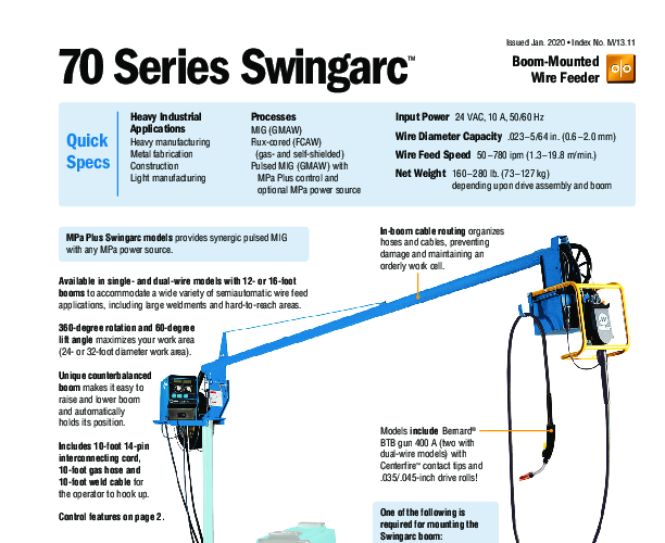 The Miller S-74D Swingarc™ (951526) is a premier industrial wire feeding solution designed to maximize productivity and safety in large-scale welding environments. This system combines the precision of the S-74D digital wire feeder with the extended reach of a 12-foot counterbalanced boom. Engineered for manufacturing sectors such as heavy equipment, shipbuilding, and railcar fabrication, the Swingarc™ system addresses the challenges of welding large assemblies by placing the wire feeder exactly where it is needed while keeping the floor clear of cables.
