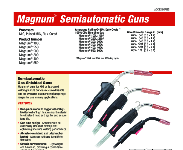 Experience the power of the Magnum® Semi-Automatic MIG welding gun, featuring an impressive 60% Duty Cycle at 250A. Specifically crafted with the welder in mind, our Magnum® MIG and flux-cored guns offer exceptional ergonomics and lightweight design, ensuring you'll never want to let go of these incredible tools. These air-cooled guns are perfectly suited for gas-shielded (MIG) and gas-shielded flux-cored (FCAW) continuous feed arc welding wires.