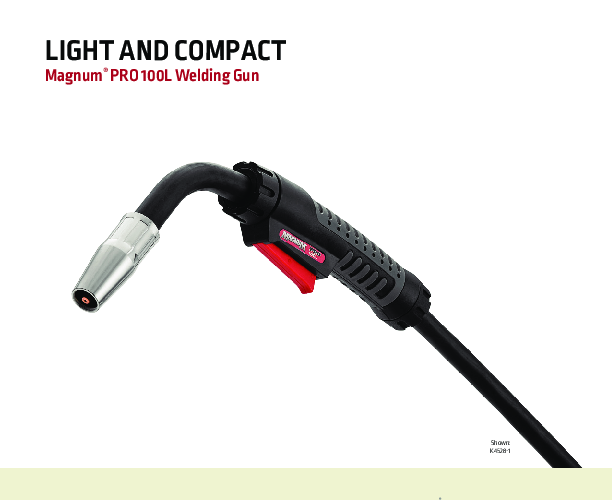 The Magnum® PRO Semi-Automatic MIG welding gun offers a 100A 100% mixed gas duty cycle for efficient welding. As part of the Magnum PRO L-series family, the Magnum PRO 100L stands out as the most compact and lightweight gun available. It is perfectly suited for a range of projects, from home and farm tasks to auto body work and light maintenance and repair applications found in small shops.
