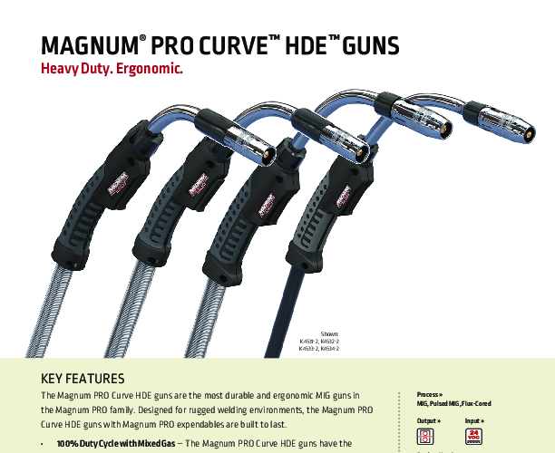 The Lincoln Electric Magnum® PRO Curve™ HDE™ 450 Welding Gun (K4533-3) represents the pinnacle of durability and performance in the semi-automatic MIG gun category. Engineered specifically for rugged environments such as heavy fabrication, structural steel, and maintenance repair, this gun is built to withstand the rigors of continuous industrial use. It distinguishes itself with a class-leading 100% duty cycle at 450 Amps, even when using mixed gas shielding. This capability ensures that the gun remains cool and operational during long weld cycles, preventing overheating and maximizing throughput in high-production settings.