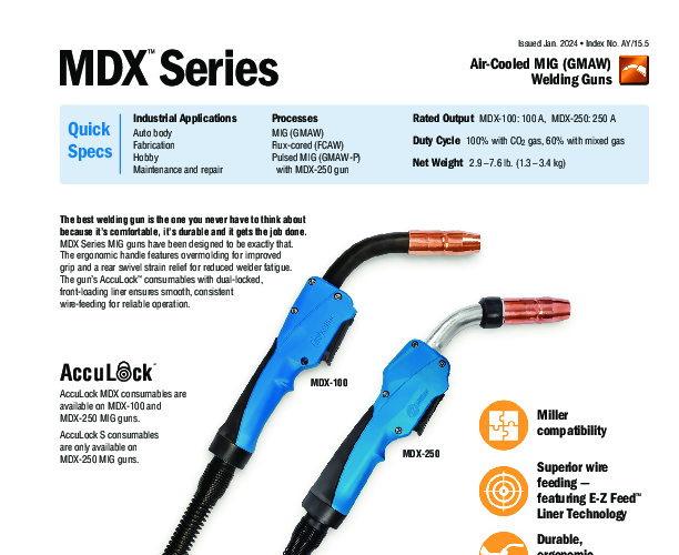 The Miller MDX-100 MIG Gun (SKU: 1770029) is a premium 15-foot welding torch designed to deliver consistent performance in light fabrication and maintenance environments. Engineered as a direct replacement for the legacy M-100 gun, this unit is fully compatible with Miller's popular compact machines, including the Millermatic 141, 142, and 211, as well as the Multimatic 215 and 220 AC/DC units. It is rated for 100 amps at a 100% duty cycle when using CO2 shielding gas, ensuring it can handle sustained operation without overheating.
