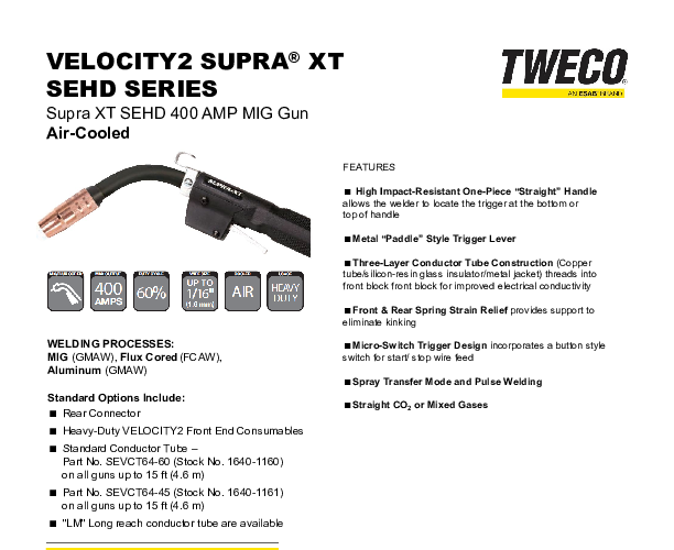 The SUPRA® XT SEHD is a heavy-duty MIG gun with a 400 Amp capacity. It is designed for tough tasks and features a high impact-resistant handle that allows the welder to position the trigger at either the top or bottom. The gun also has a metal paddle-style trigger lever for easy operation. Its three-layer conductor tube construction ensures improved electrical conductivity, and the front and rear spring strain relief offers support to prevent kinking. The micro-switch trigger design includes a button-style switch for convenient start and stop of wire feed. The gun supports both spray transfer mode and pulse welding. It can be used with straight CO2 or mixed gases.