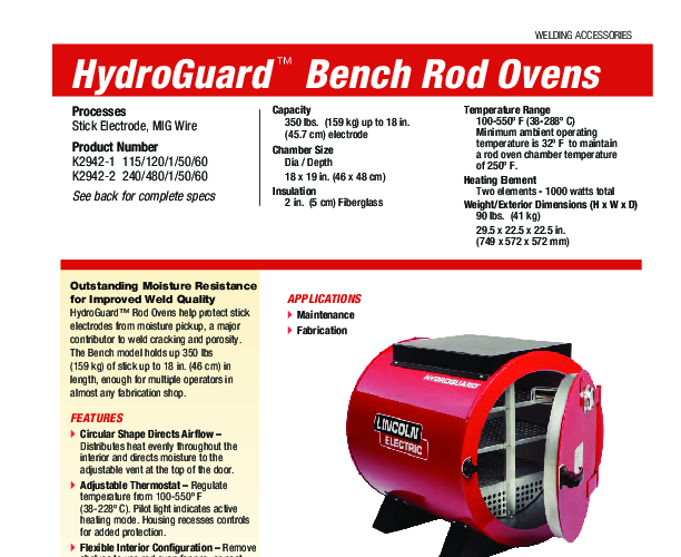 The Lincoln Electric HydroGuard Bench Electrode Oven (K2942-1) is a critical asset for fabrication shops adhering to strict welding codes and quality standards. Designed to mitigate the risks associated with hydrogen-induced cracking and porosity, this oven maintains stick electrodes at optimal temperatures, preventing moisture absorption from the ambient environment. With a substantial holding capacity of 350 lbs (159 kg), it is sized to support multiple operators in high-throughput environments such as structural steel fabrication, shipbuilding, and heavy equipment repair.
