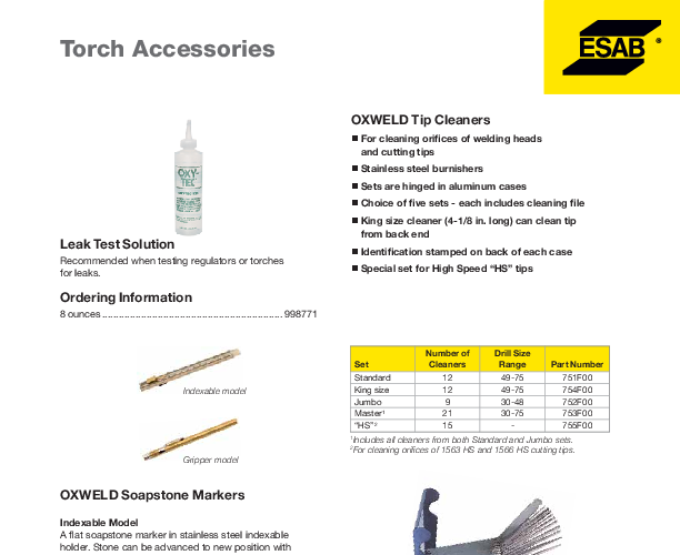 In the world of gas welding and cutting, the quality of your flame dictates the quality of your work. A clogged or dirty tip can lead to erratic flames, poor heat distribution, and messy cuts. The ESAB 753F00 Tip Cleaner Master Set is an essential maintenance tool designed to keep your oxy-fuel equipment performing at its peak. This comprehensive set ensures that gas flow remains unobstructed, providing the consistent, neutral flame required for precision brazing, welding, and cutting.