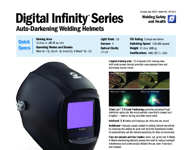 The Miller Digital Infinity™ Honor™ Welding Helmet (SKU: 280054) represents the cutting edge of personal protective equipment for industrial applications. Engineered for professional welders who demand precision and control, this helmet features the industry-leading ClearLight™ 2.0 Lens Technology. This advanced optical system provides a high-definition, natural color view of the weld pool, enhancing clarity before, during, and after the weld. By optimizing contrast and brightness, ClearLight™ 2.0 reduces eye strain and allows for more precise bead placement.