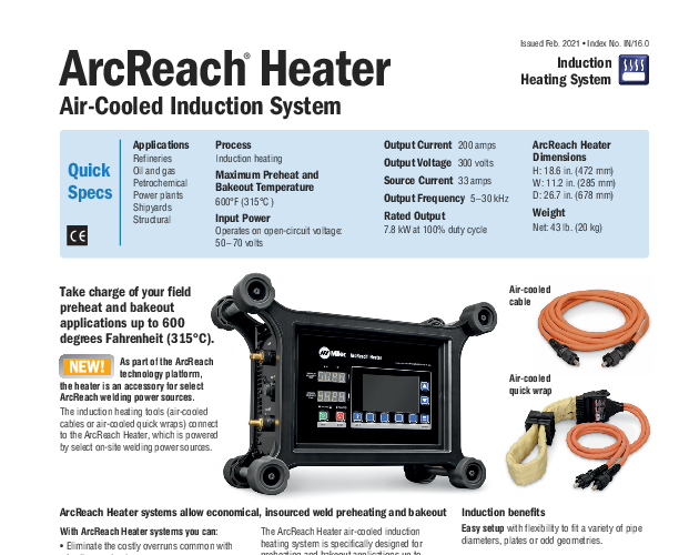 The system is designed for flexibility. It is compatible with a choice of heating tools, including flexible Air-Cooled Cables for odd geometries and plate work, or the Air-Cooled Quick Wrap for rapid setup on pipes up to 10 inches in diameter. This versatility ensures that whether you are welding flat plate or complex pipe spools, the ArcReach Heater can adapt to the specific geometry of your workpiece.