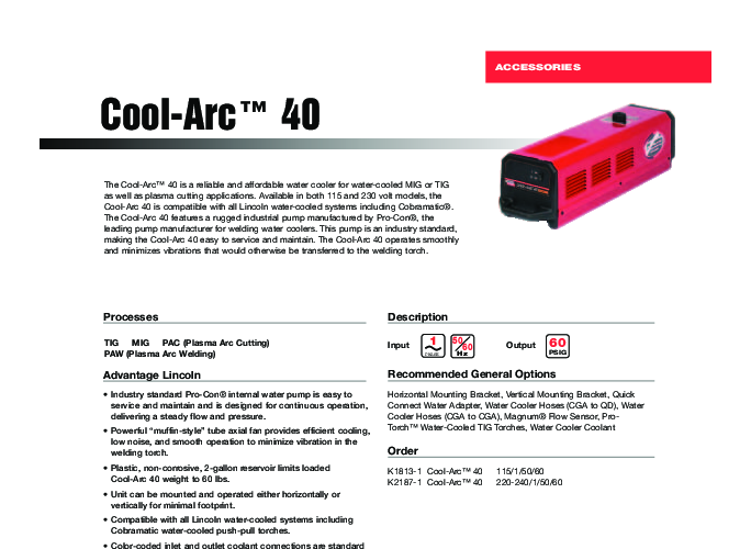 The Lincoln Electric Cool Arc® 40 (230V) is engineered to provide robust thermal management for high-amperage welding applications. Designed for professional fabrication environments, this unit ensures that water-cooled MIG guns, TIG torches, and plasma cutting systems operate within optimal temperature ranges, preventing equipment overheating and extending consumable life. At the heart of the Cool Arc 40 is the industry-renowned Pro-Con® internal water pump. Known for its reliability in industrial fluid handling, the Pro-Con pump delivers consistent flow and pressure, ensuring efficient heat dissipation even during extended duty cycles. The pump is designed for easy serviceability, reducing downtime and maintenance costs for industrial facilities.