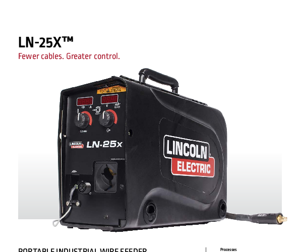 With a wire feed speed range of 50 to 700 IPM and a maximum rating of 450 Amps, the LN-25X is a powerhouse capable of handling both MIG and Flux-Cored processes. It supports wire spools up to 12 inches in diameter and wire sizes up to 1/16 inch for solid wire and 5/64 inch for cored wire. This feeder is the ideal solution for professionals demanding reliability, precision, and ruggedness in one portable package.