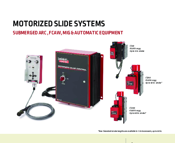 The Lincoln Electric MS250 5 x 5 Motorized Slide System One-Pak (K52009-0505) is a comprehensive solution designed to enhance precision and efficiency in automated welding environments. Engineered for versatility, this two-axis slide system provides robust motorized control for torch positioning across a variety of arc welding processes, including Submerged Arc (SAW), Gas Metal Arc (GMAW), Flux-Cored (FCAW), and Gas Tungsten Arc (GTAW). The system is specifically calibrated to offer a 5-inch by 5-inch (127 mm x 127 mm) stroke, allowing for significant adjustment range in both horizontal and vertical axes, which is critical for maintaining optimal electrode stick-out and seam tracking during continuous welding operations.