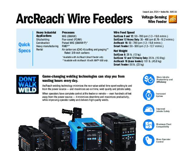 The Miller ArcReach Suitcase 8 Wire Feeder Package (951726001) is designed to revolutionize how industrial welding operations are conducted in the field. This comprehensive package pairs the rugged durability of the Suitcase 8 feeder with the premium performance of a Bernard BTB 300 Amp MIG gun, offering a complete solution for shipbuilders, construction crews, and heavy manufacturers. The standout feature of this system is Miller's ArcReach technology, which allows for full remote voltage and amperage control directly at the wire feeder without the need for a separate control cable. By communicating signals through the welding leads themselves, this system eliminates the clutter, expense, and maintenance headaches associated with fragile control cords.