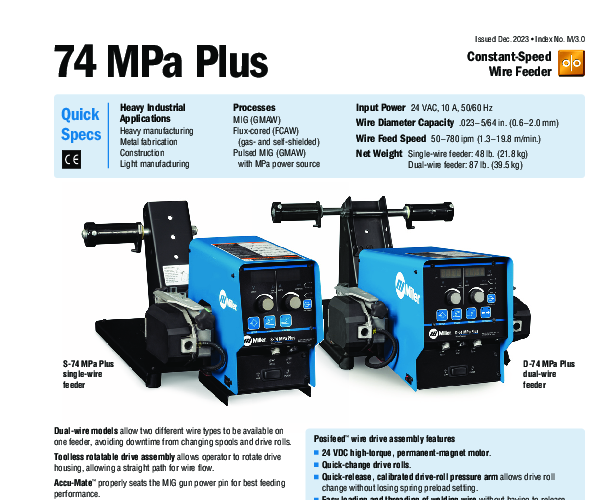 The Miller S-74 MPa Plus Single Wire Feeder (951291001) represents the pinnacle of industrial wire feeding technology, designed to meet the rigorous demands of heavy manufacturing, shipbuilding, and construction. This package is engineered to provide seamless integration with Miller's advanced power sources, specifically the Invision™ MPa and XMT® MPa series. When paired with these power supplies, the S-74 MPa Plus unlocks Synergic Pulsed MIG capabilities, allowing the system to automatically adjust pulse parameters as wire speed changes. This communication ensures optimal power delivery and arc stability without the need for constant manual adjustments, streamlining complex welding procedures.