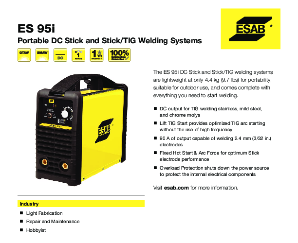 The ESAB 95i constitutes a highly portable, inverter-based DC welding power source engineered for both Shielded Metal Arc Welding (SMAW/Stick) and Gas Tungsten Arc Welding (GTAW/TIG) applications. This unit is specifically designed to operate on 115 VAC primary power, making it universally compatible with standard household and commercial utility outlets via the included 15-20 A adapter configuration. The system's core architecture utilizes advanced inverter technology to minimize mass and volume, resulting in a net weight of only 4.4 kg (9.7 lbs), which significantly enhances operator mobility in field maintenance scenarios.