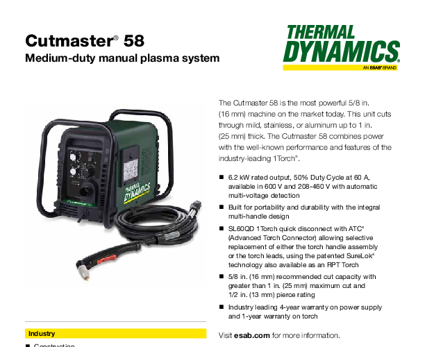 The Thermal Dynamics Cutmaster 58 (SKU: 1-5831-5) is a robust plasma cutting solution engineered for heavy-duty industrial environments requiring 600V 3-phase input. This specific configuration pairs the proven reliability of the Cutmaster 58 power source with the versatility of the SL60QD 1Torch and an extended 50-foot (15.2 m) lead, offering superior reach and operational flexibility in large shops and manufacturing plants.